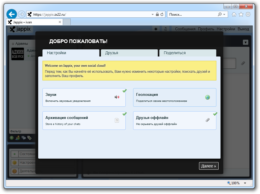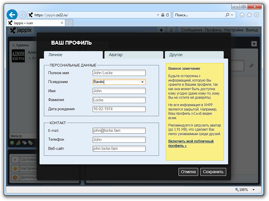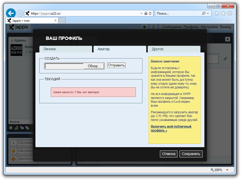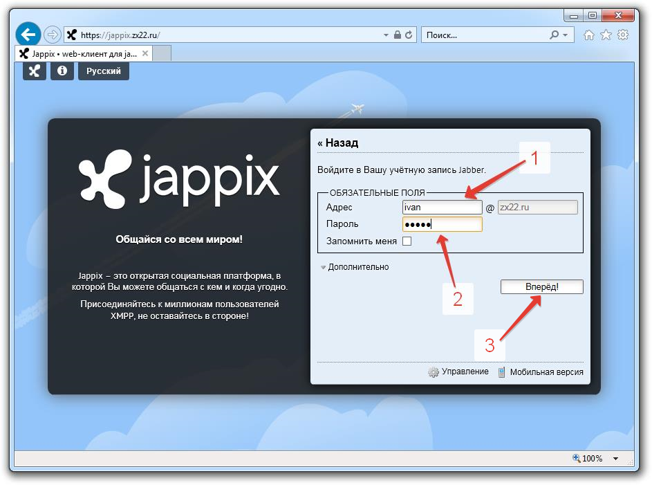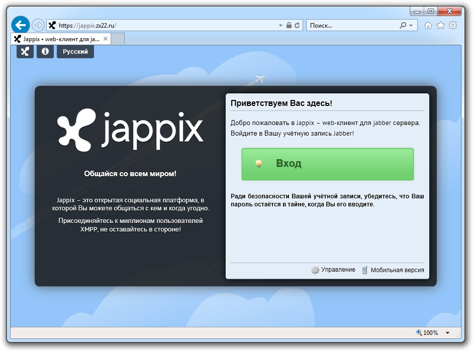 WEB-клиенты позволяют подключиться к Jabber-серверу через браузер. Есть множество различных WEB-клиентов и Вы можете подключаться к нашему серверу используя любые из них (не обязательно установленные у нас). На нашем сервере работают WEB-клиенты Movim и Jappix, из них мы рекомендуем использовать Movim, так как клиент Jappix уже устарел и не поддерживает многие функции.